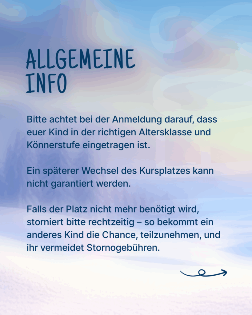 Bitte melde dein Kind nur für eine Kursart und nur für einen Termin an. Bei Unter- oder Überforderung suchen wir, wenn möglich, eine passende andere Gruppe. Eine Übersicht der Könnenstufen findest Du untenstehend.